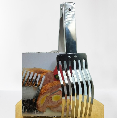 Cette pince en inox va faciliter la découpe de votre rôti, le peigne délimite votre découpe !