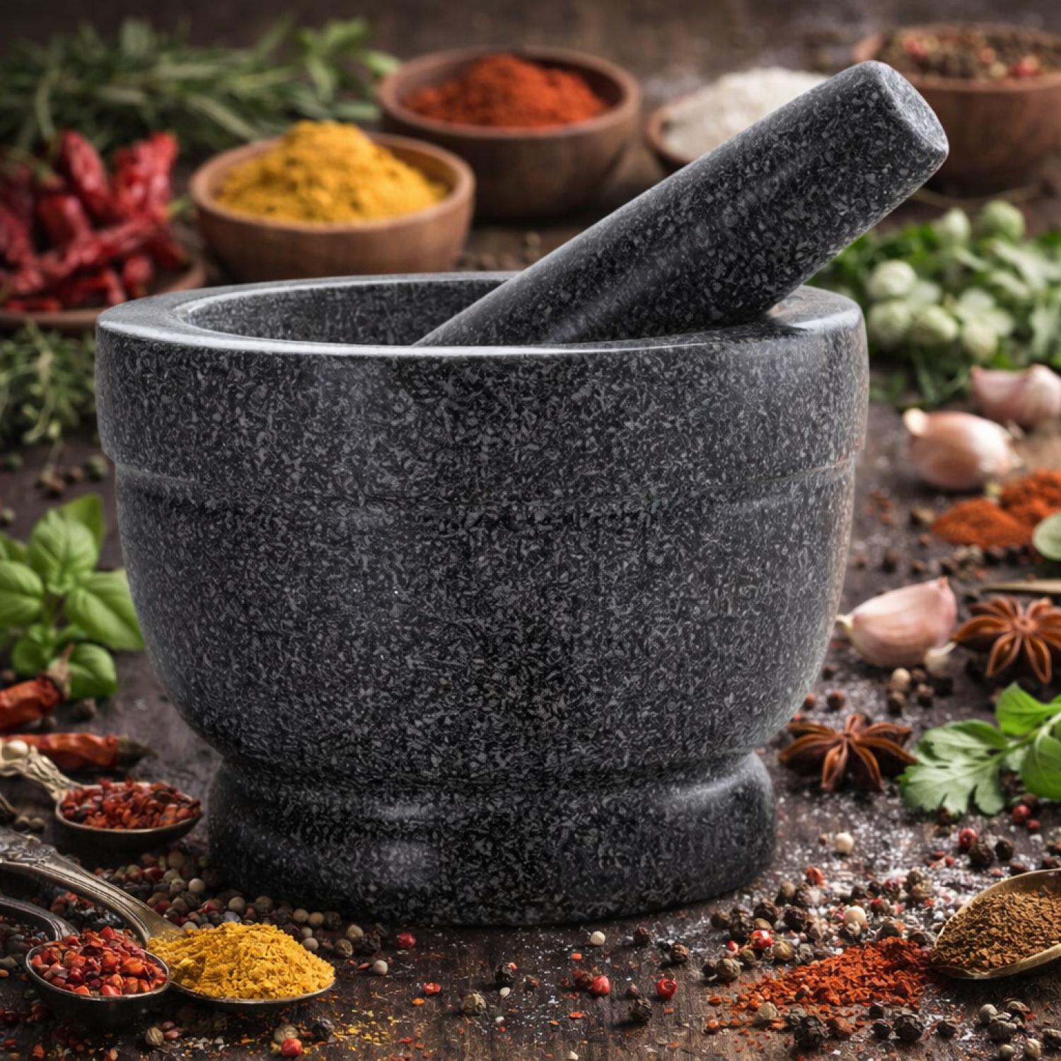 Le mortier-pilon est composé de granit de qualité supérieure. Lourd et bien équilibré, il est parfait pour le broyage et le concassage. Son ergonomie facilite les manoeuvres et réduit les efforts.