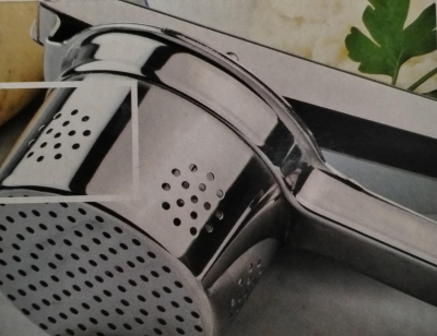 Presse purée en inox avec trous latéraux manuel avec levier, facile à nettoyer.