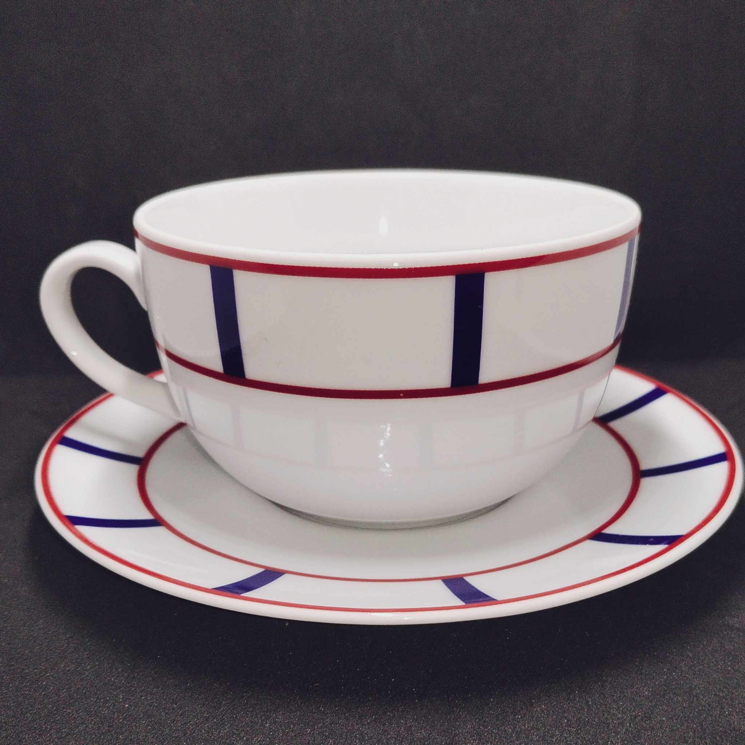 Tasse à déjeuner / Jumbo Basque de couleur bleu et rouge en porcelaine pour respecter la tradition d'antan, avec sa sous tasse des memes couleurs. Vous pouvez le passer au lave vaisselle, il est resistant.