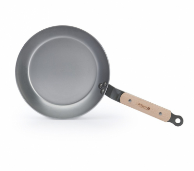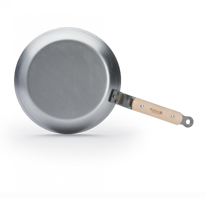Poêle Mineral en tôle d'acier et son manche en bois de hêtre tout recouvert d'une protection à la cire d'abeille, pour une résistance longue durée.