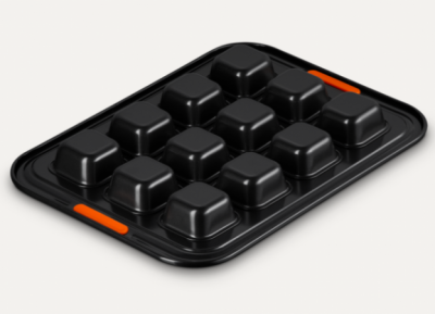 Cette plaque contient 12 empreintes à brownies avec un revetement anti-adhérant en acier de carbone pour une garantie à vie.