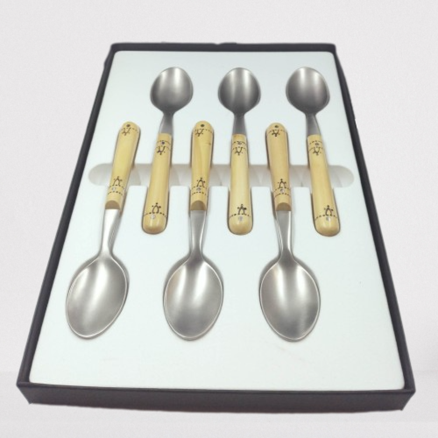 Coffret de 6 cuillière à café de table Nontron, avec un manche en buis décor pyrogravé et cuillière en acier inoxydable finition satiné, fabriqué en France.