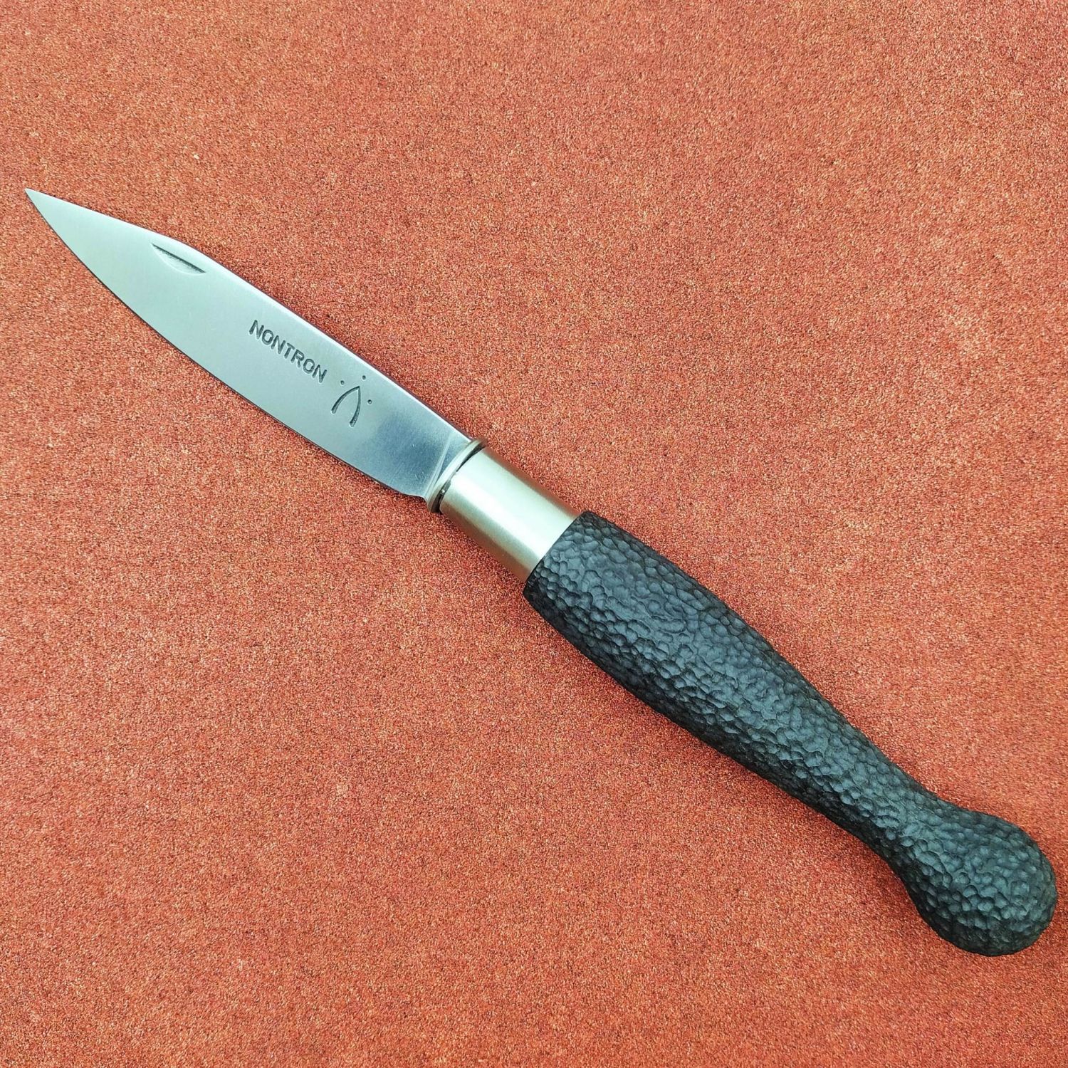 Véritable couteau de Nontron, modèle original avec son manche en boule ébène aspect truffe,virole et lame acier inoxydable.