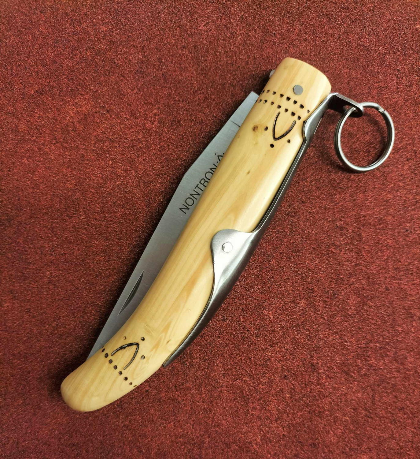 Véritable couteau Nontron avec son manche en buis pyrogravé, vous avez un cran d'arret par l'anneau.