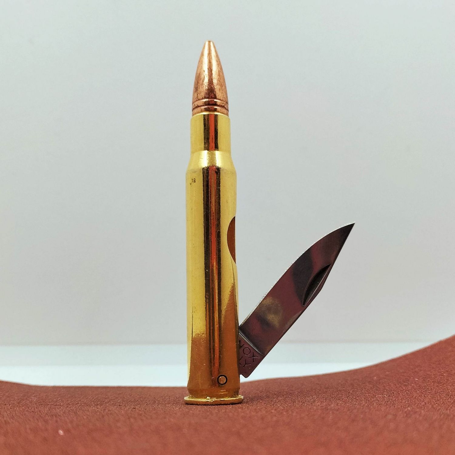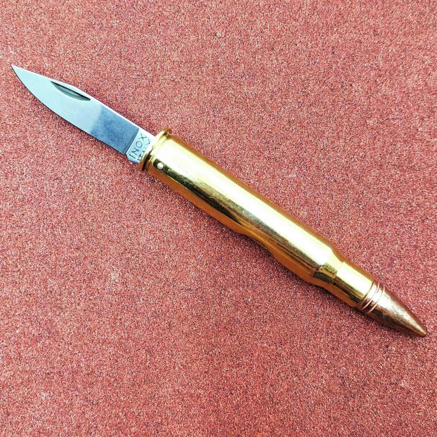 Ce couteau pliant à manche en laiton et lame de 4,5 cm en acier inoxydable ressemble à une balle de fusil.