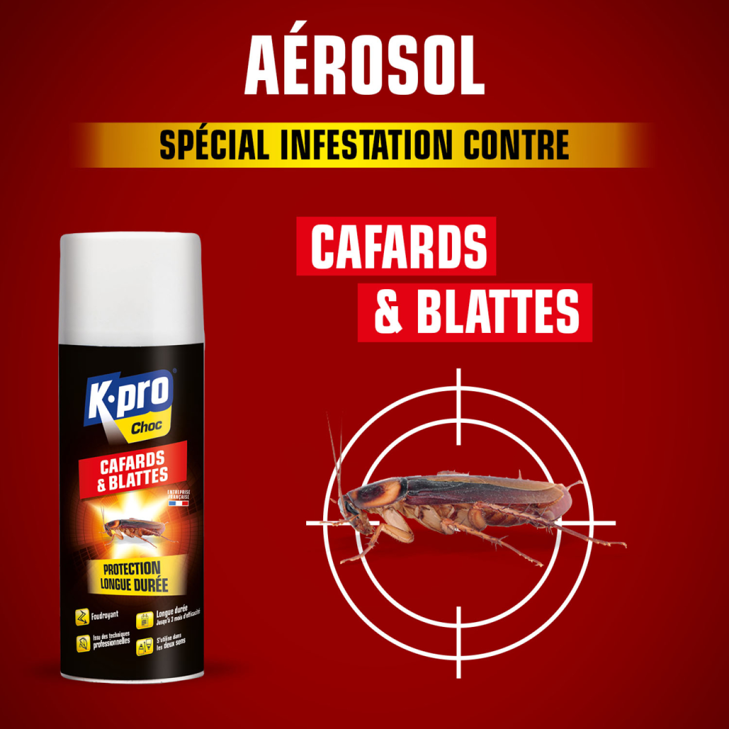 Le spray « Cafards & Blattes » est un insecticide pour éradiquer les cafards et les blattes de votre intérieur. Sa formule puissante à double action permet un effet foudroyant immédiat et une protection longue durée jusqu’à 3 mois.