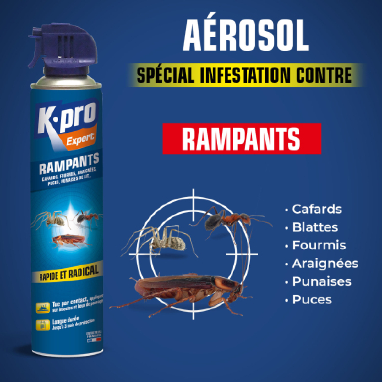 L'aerosol "Rampants" est un insecticide prêt à l’emploi conçu pour éliminer efficacement les insectes rampants : cafards, blattes, fourmis, perce-oreilles, araignées, puces, etc. Spray rapide et radical, avec une protection longue durée, l'action est immédiate.