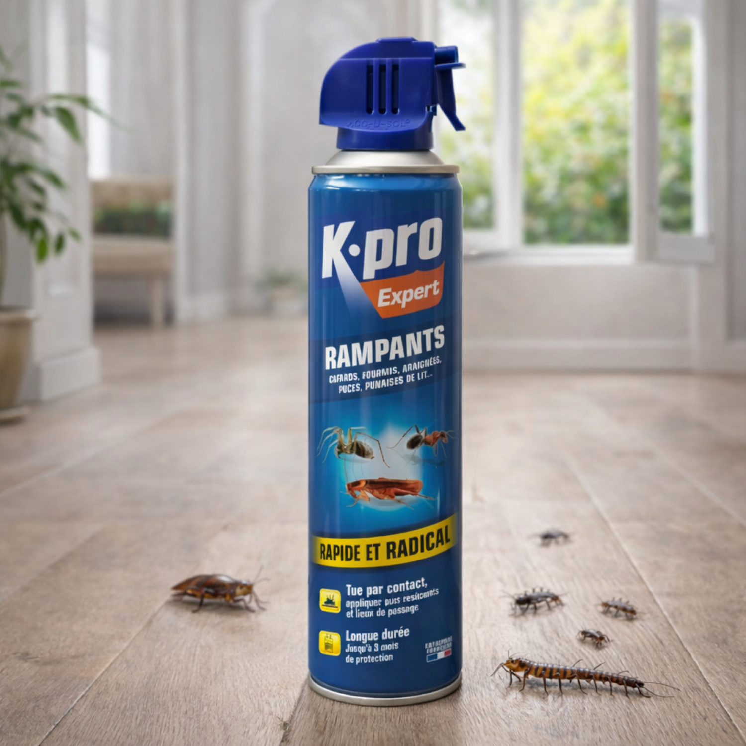 Les surfaces traitées continue d'agir jusqu'à 3 mois. La bombe s'utilise dans les deux sens. Agiter avant l'emplois