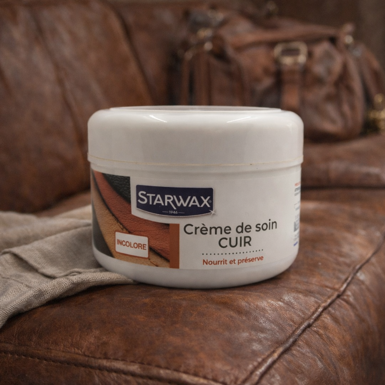 La crème de soin cuir Starwax est spécialement formulée pour entretenir tous les articles en cuir : chaussures, sacs, canapés, vestes et accessoires. Elle nourrit en profondeur, protège contre le dessèchement, les taches et l’usure tout en ravivant l’éclat naturel du cuir. Sa texture facile à appliquer pénètre rapidement sans laisser de film gras. Résultat : un cuir plus souple, plus beau et durable. Idéale pour un entretien régulier ou pour redonner vie à des pièces usées, elle est un indispensable pour préserver vos cuirs favoris.