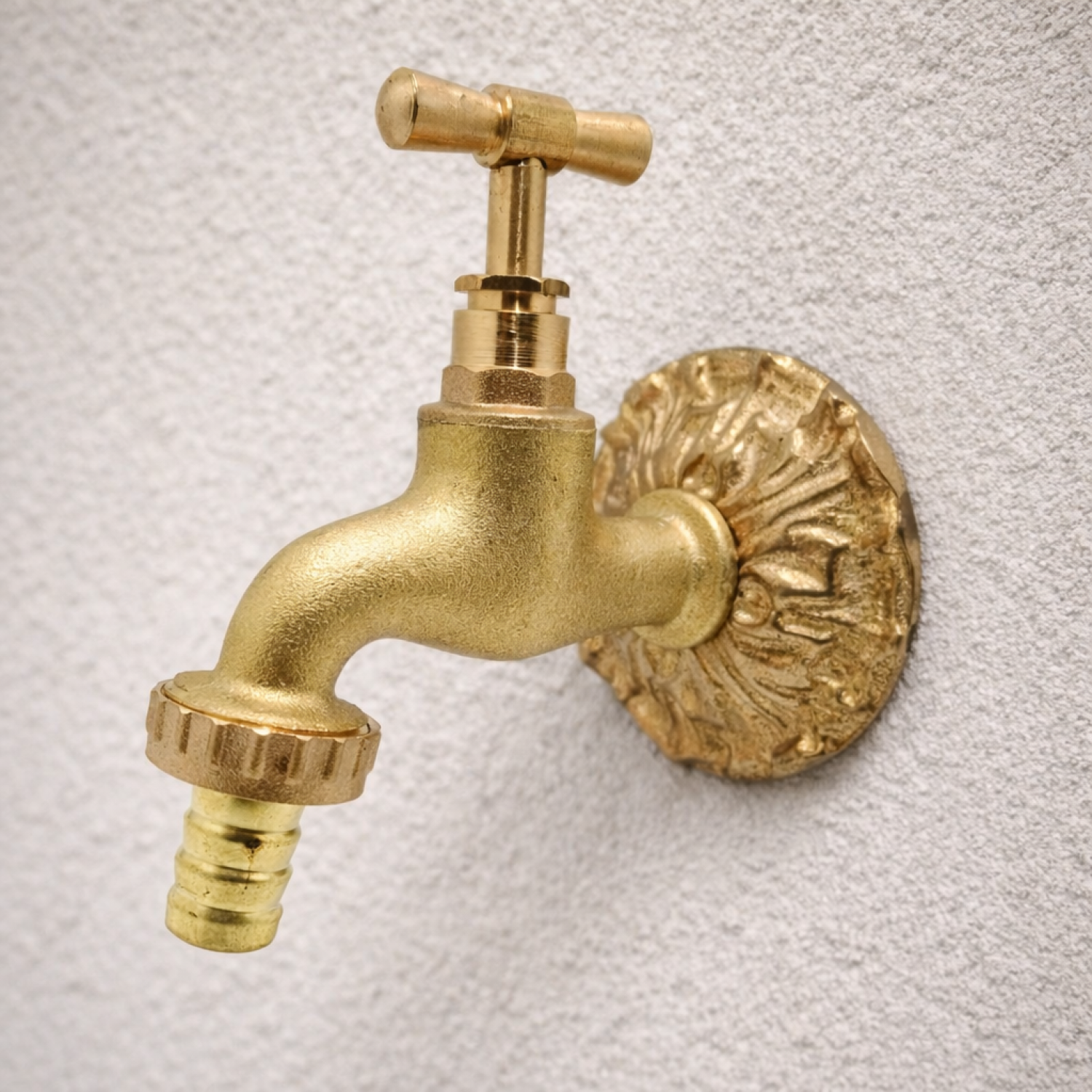 Robinet de jardin très décoratif avec sa rosace, possibilité de raccorder un tuyau d'arrosage standard, et/ou convient pour des fontaines d'extérieur.
