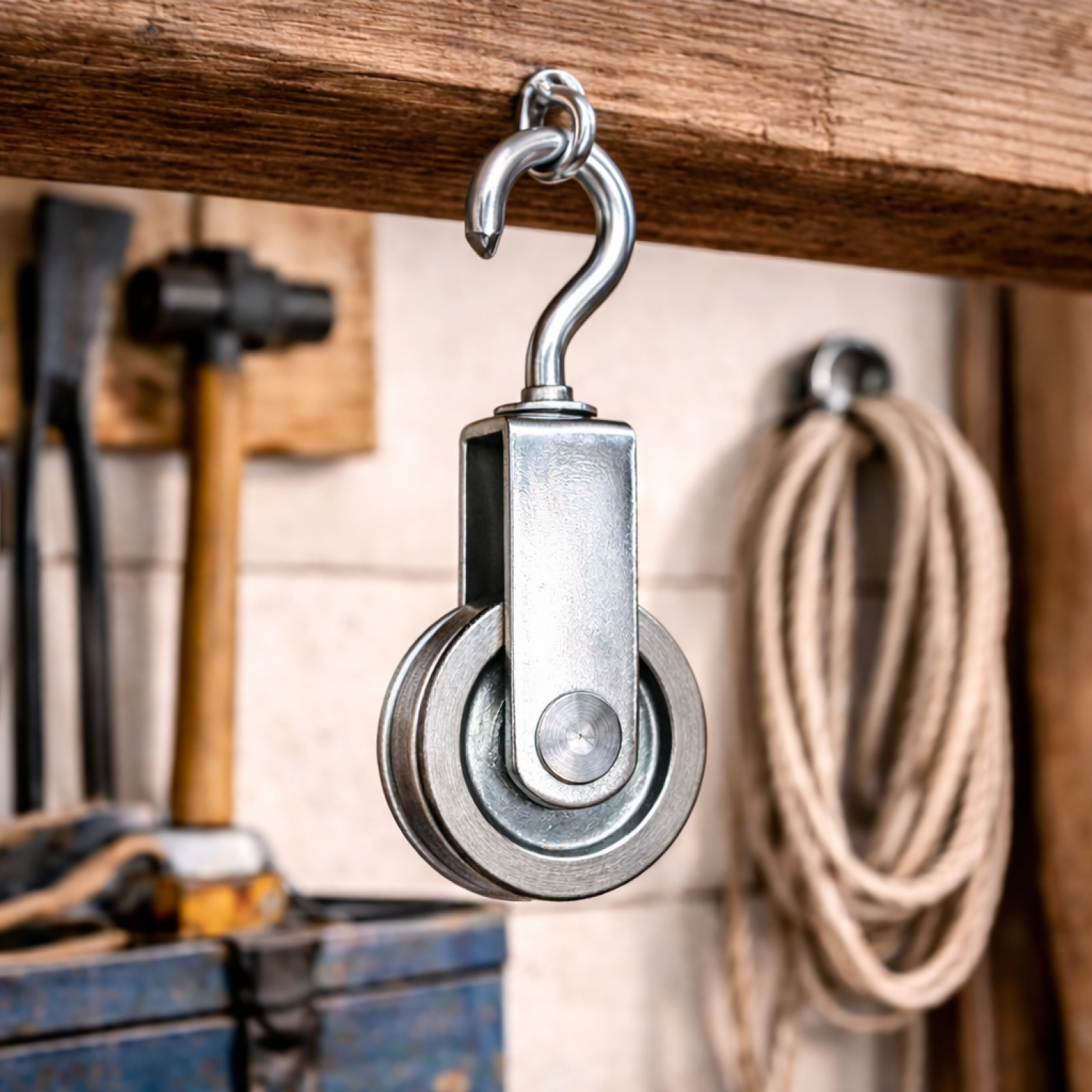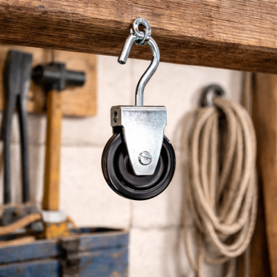 La poulie avec crochet rotatif en acier zingué est un accessoire robuste conçu pour faciliter le levage et le guidage de cordes ou câbles. Équipée d'un crochet rotatif, elle permet une grande liberté de mouvement et évite les torsions lors de l'utilisation. Sa structure en fonte assure une excellente résistance et une durabilité optimale, même en usage intensif. Idéale pour les travaux de manutention, d'atelier ou d'extérieur, elle garantit un fonctionnement fluide et fiable. La gorge de la polie est ronde.