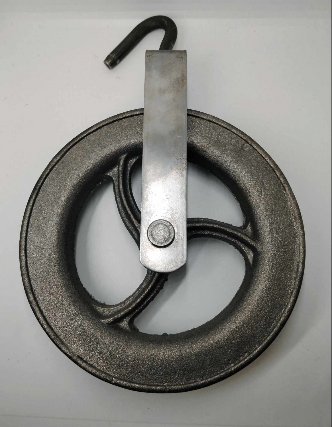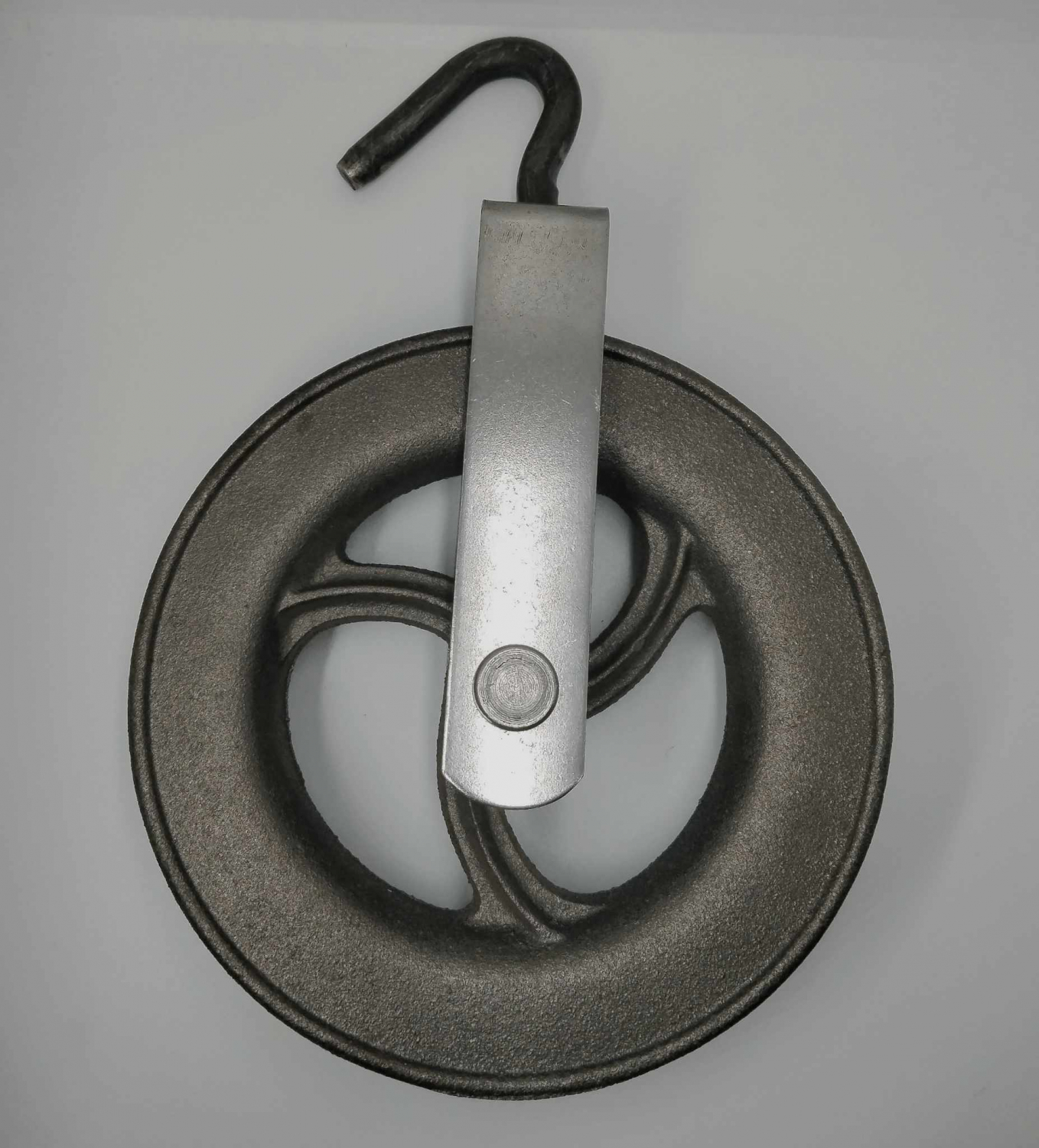 Poulie en fonte brut pour puits avec son crochet en acier zingué roratif. La force est excercée sur le crochet. La gorge de la polie est ronde.