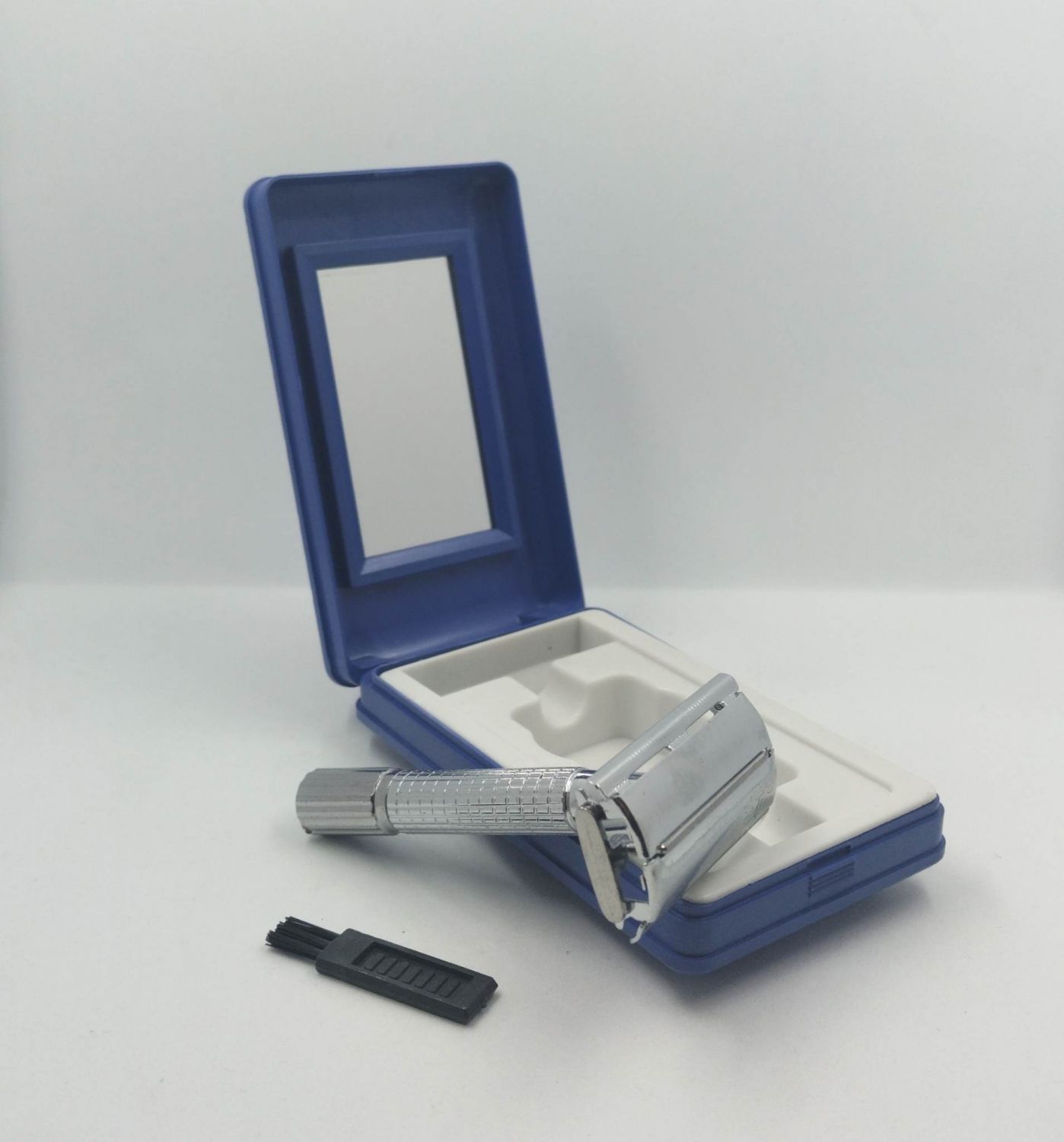 Pour un rasage comme chez le barbier : Coffret rasoir mécanique double lame aspect argenté.