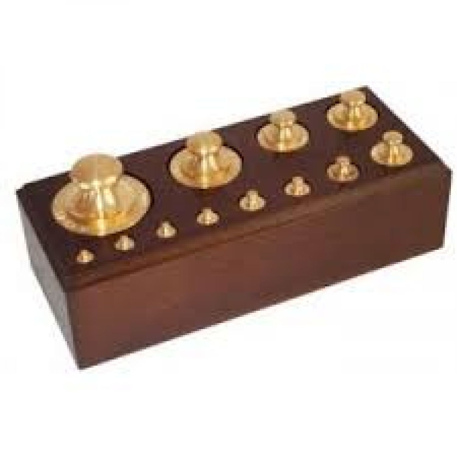 Une série de 12 poids en laiton pour un total de 500g sur son socle en bois, contient les poids de 1g, 2g x2, 5g, 10g x2 , 20g, 50g, 100g x2 , 200g, 500g