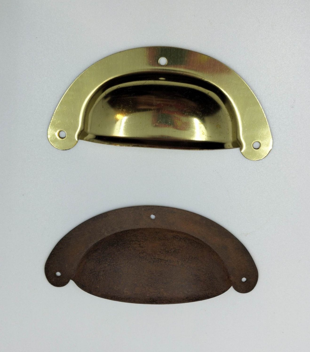 Poignée coquille convient pour des petits coffres, des portes de placard ou autres.. sous 2 teintes : Fer rouillé, Laiton
