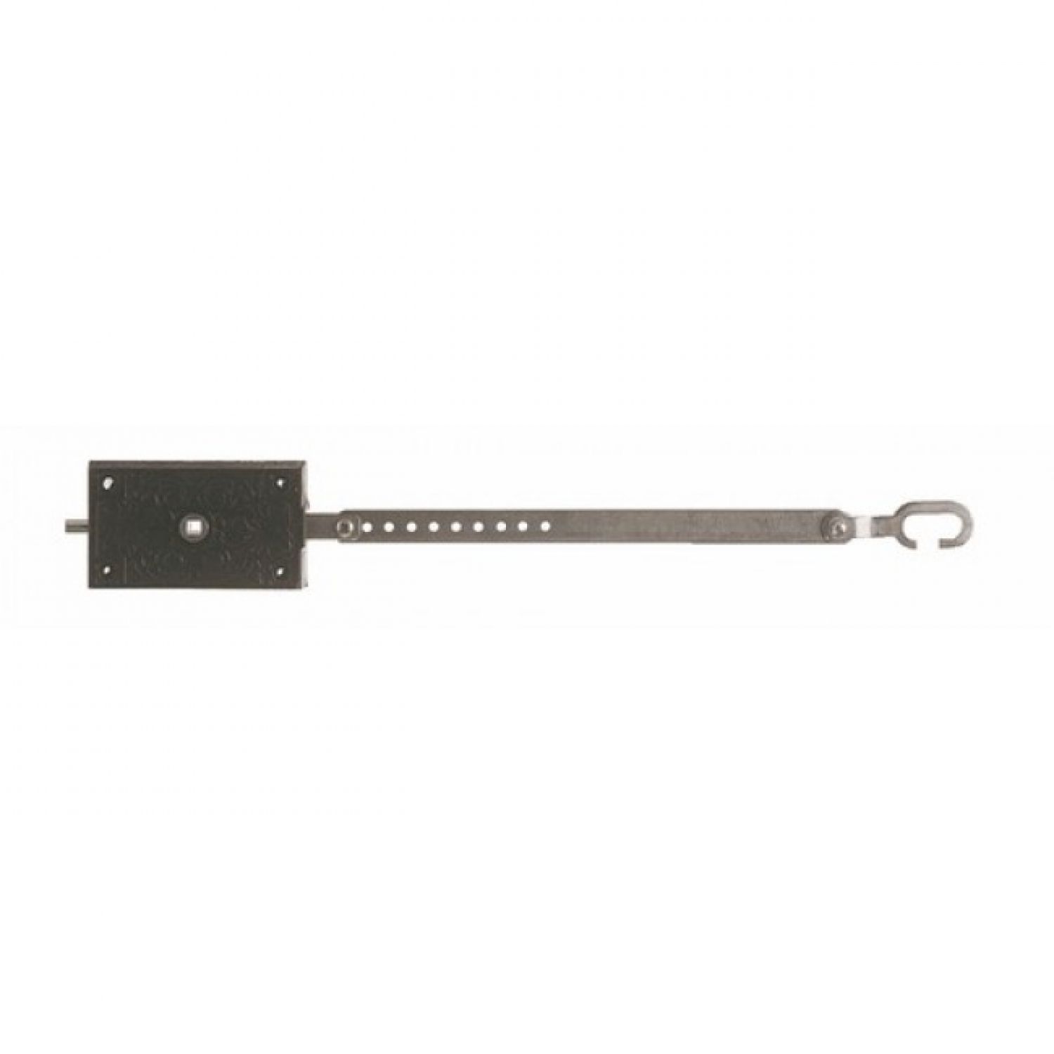 Ce boitier en fonte permet de relier le crochet d'une serrure en applique à tirage à un bouton de porte à chainette afin d'ouvrir la porte de l'extérieur. La boite est en fonte.