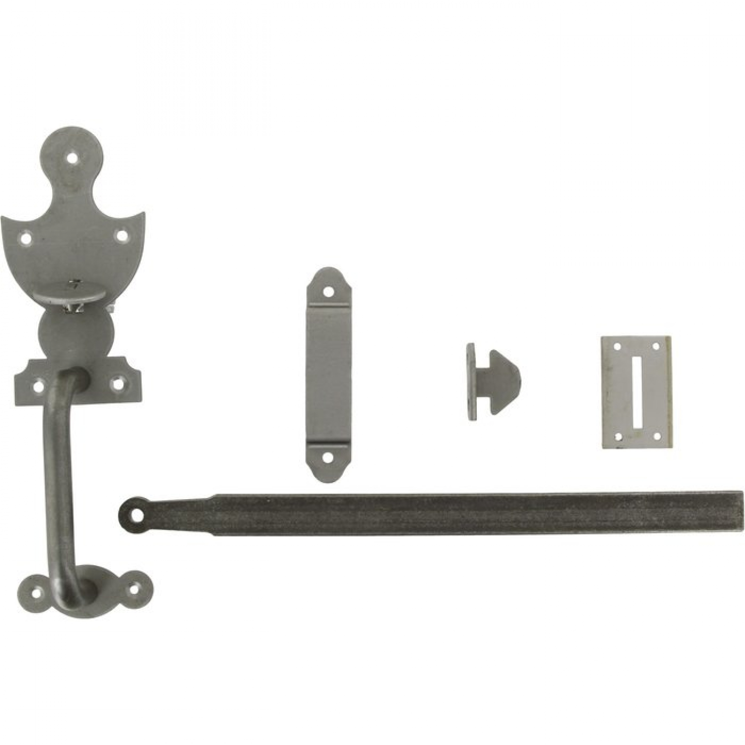 Poignée fixe hauteur totale 23 cm, dégagement 40 mm. Battant de 30 cm, fer de 15x4 mm. Longueur du crochet 80 mm. Finition brut.